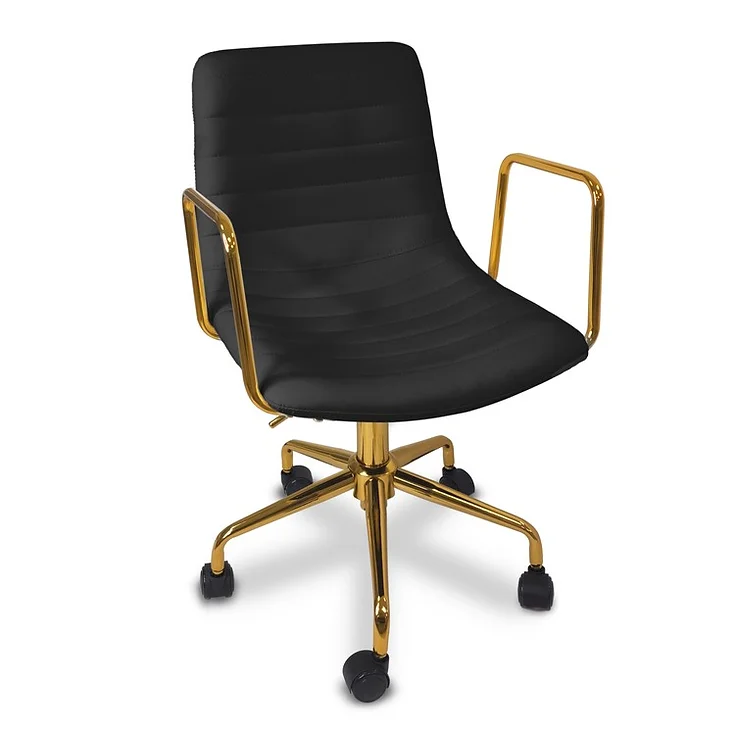 כיסא יוקרתי ומעוצב עם ידיות ובסיס בצבע זהב, המשלב סגנון אלגנטי ונוחות מקסימלית. אידיאלי למי שמחפש להוסיף טאץ' של יוקרה לכל חלל עבודה.