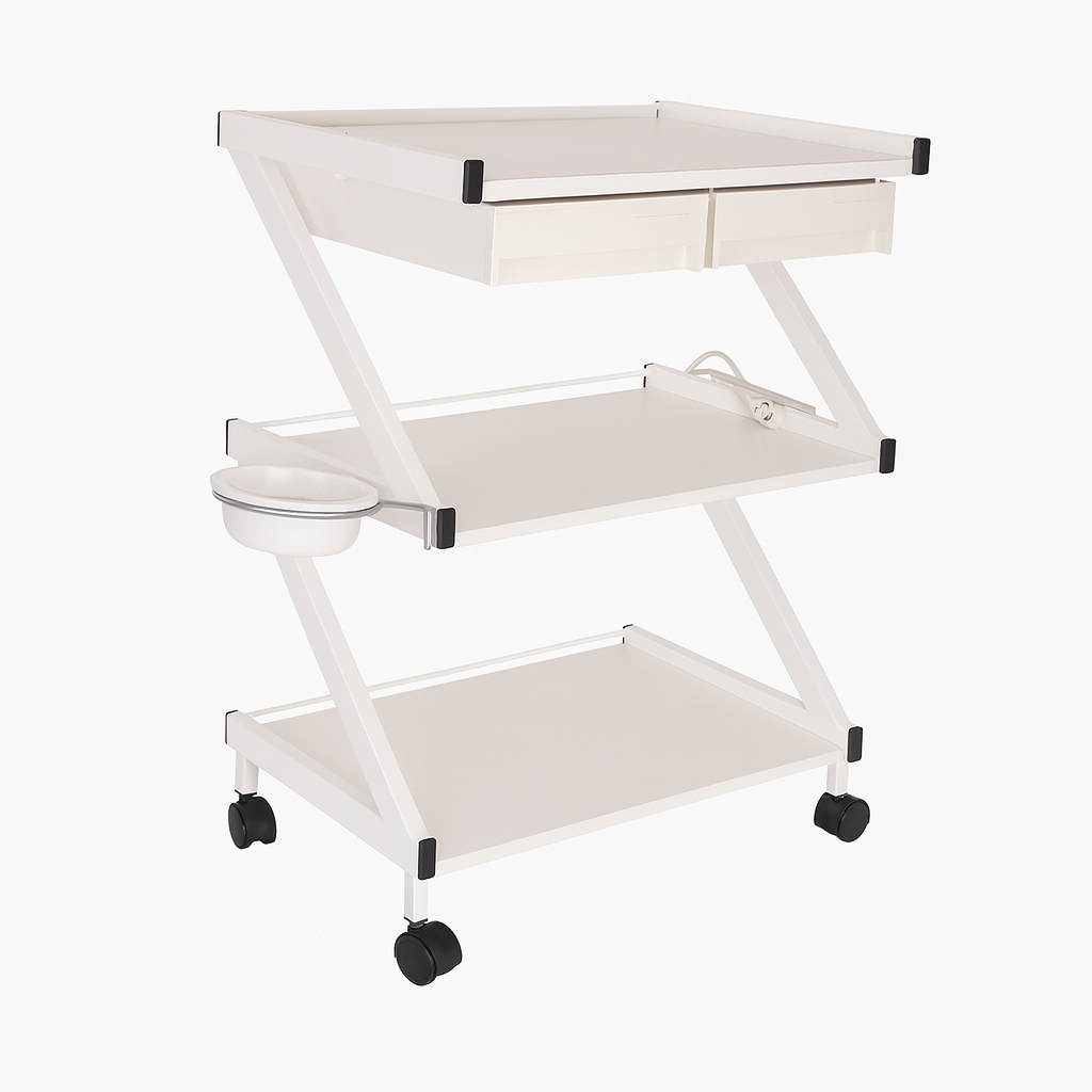 עגלת הטיפולים Z עם 3 מדפים ו-2 מגירות פלסטיק היא פתרון יעיל ופרקטי למקצועניות בתחום הקוסמטיקה שמחפשות ארגון מרוכז ונוחות במהלך העבודה. בעזרת עגלת הטיפולים הזו, ניתן לשמור על סדר וארגון בכל רגע נתון ולשמור על ניקיון ויעילות במהלך העבודה.