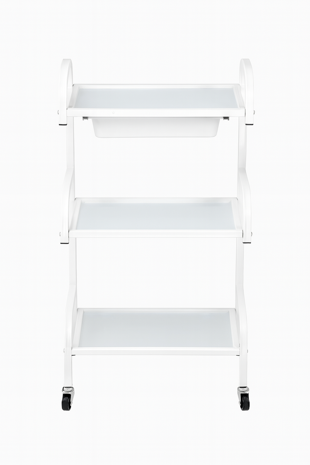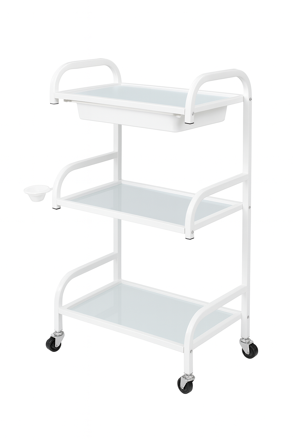 עגלת טיפולים איכותית ומעוצבת בגודל 40/50 ס"מ, מושלמת לשימוש במרפאות, מכוני יופי וקליניקות. העגלה כוללת 3 מדפי זכוכית עמידים ובנוסף מגירה נשלפת מִפְלַסטיק לאחסון נוח של ציוד.