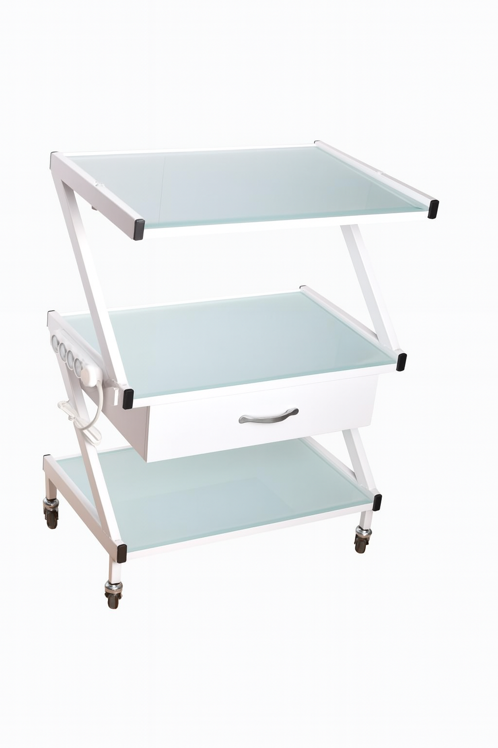 מבנה מתכת חזק ועמיד עם שלוש קומות זכוכית חלבית איכותית, מגירה אמצעית לאחסון ציוד, וגלגלים שקטים לניוד קל ונוח במרחב העבודה.